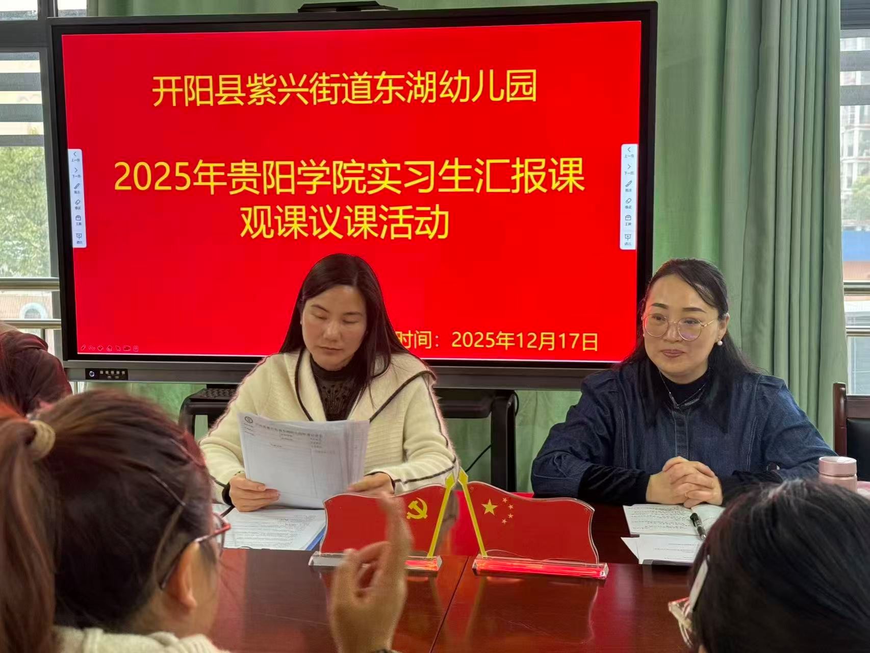教无止境,学思不怠。为检验2022级学前教育实习生教学实践成效,夯实专业实践能力,促进实习教师的专业成长。2025年1 2月17日,贵阳学院教育科学学院实习指导教师何芸、实习基地东湖幼儿园园长欧英花、书记谭静及副园长何勇飞一同观摩了2025年贵阳学院实习生的汇报课。