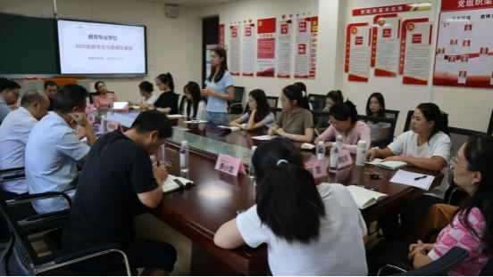 2025年9月16日,教育科学学院2025级教育硕士研究生与导师见面会,在教育科学学院三楼会议室隆重召开。本次会议以“深化联系、共谋发展”为主题,通过师生面对面交流,帮助新生快速融入学术氛围。会议由阮院长主持,学院导师组全体成员及硕士生实践实训导师杜文鲜(双龙临空经济区第一实现小学校长)冷小雪(贵阳市中心实验幼儿园园长)及2025级12名教育硕士研究生参会。